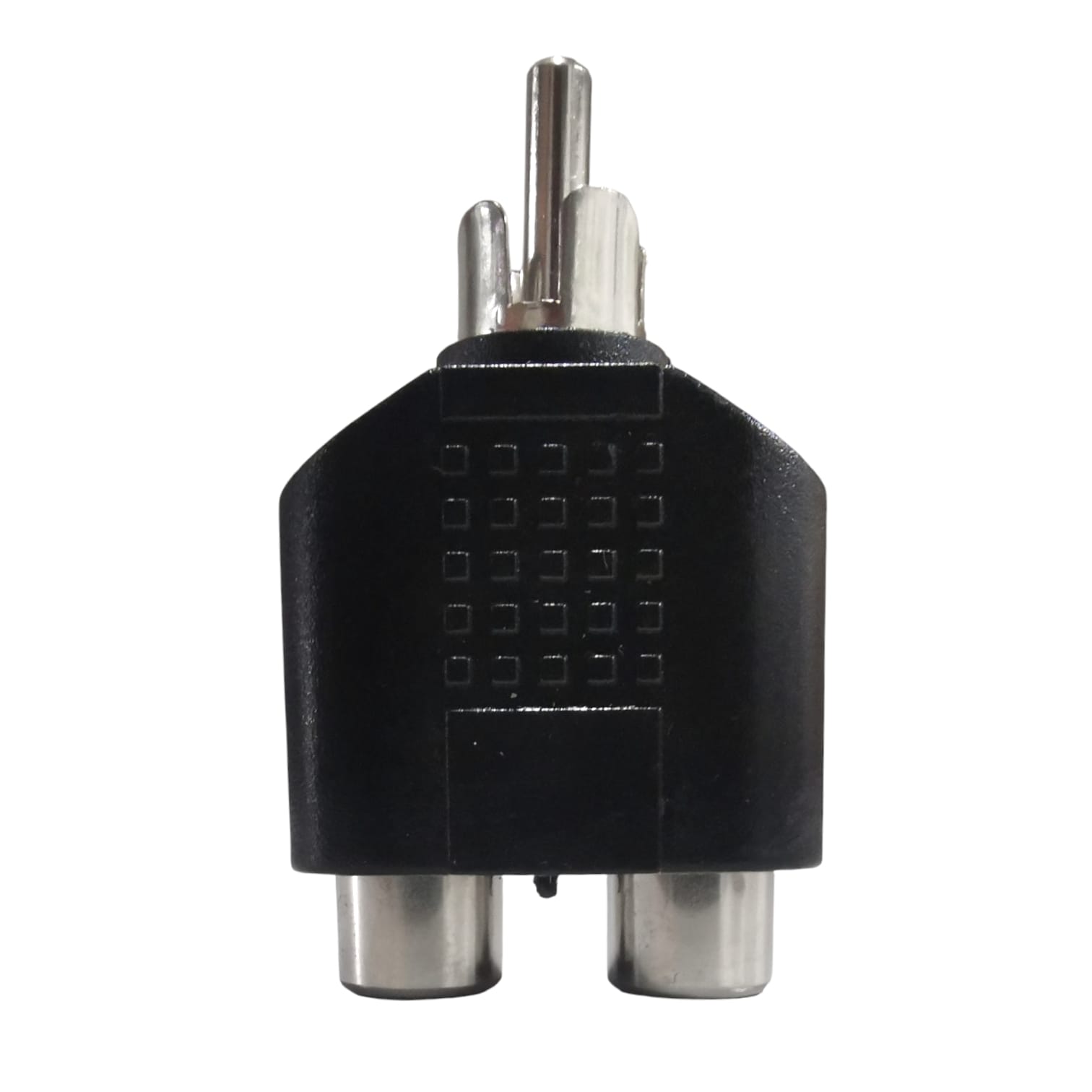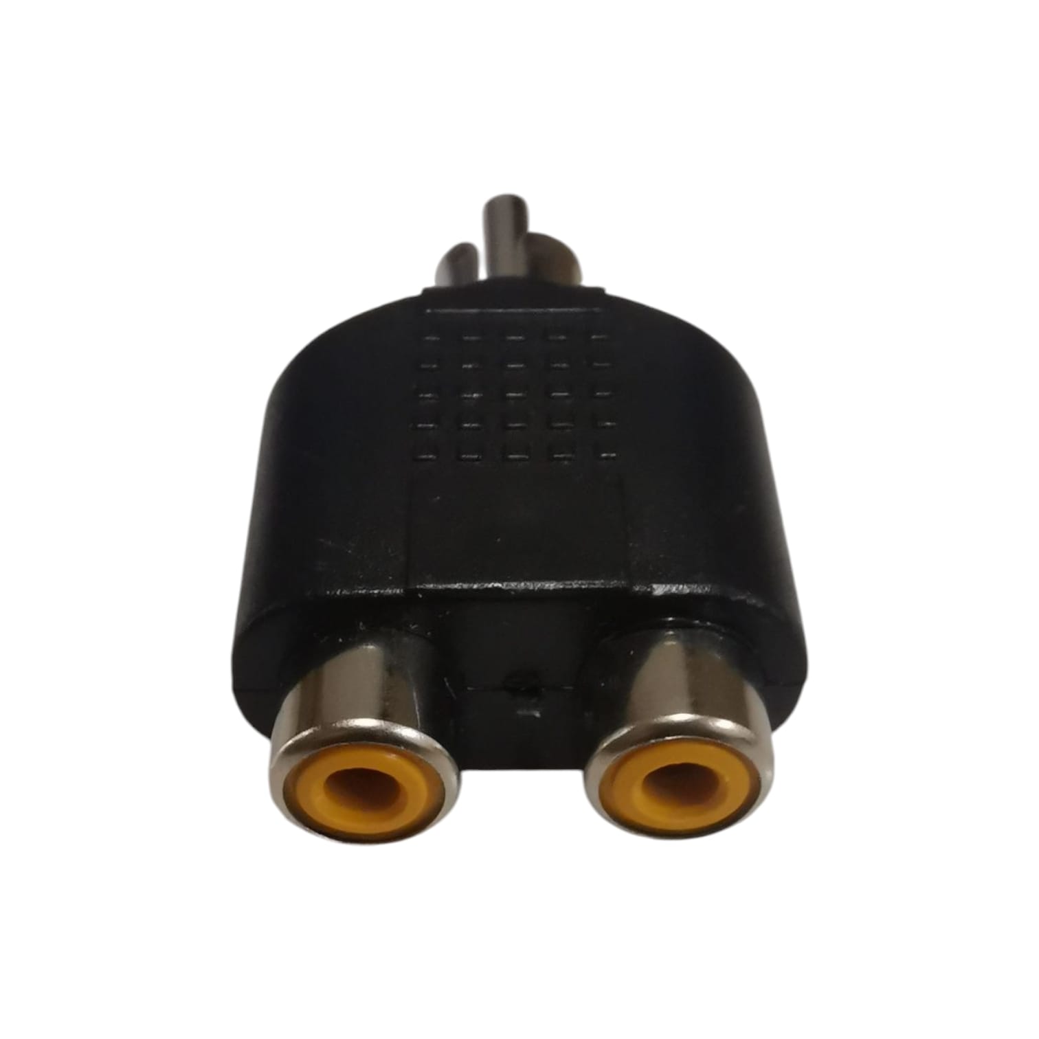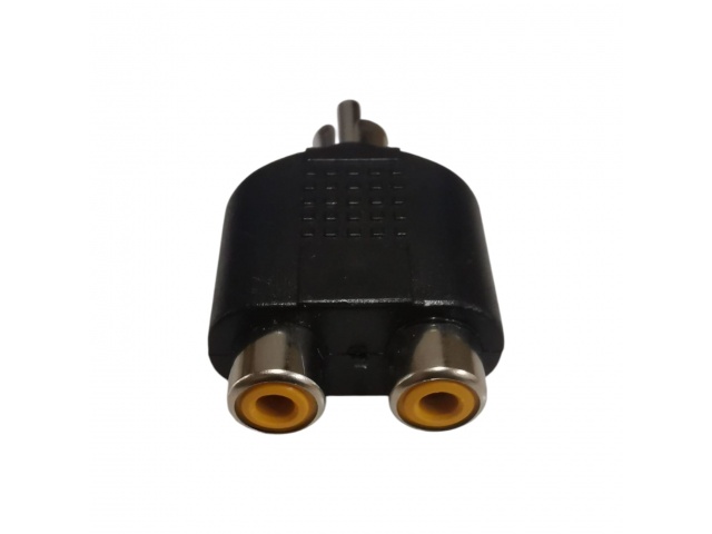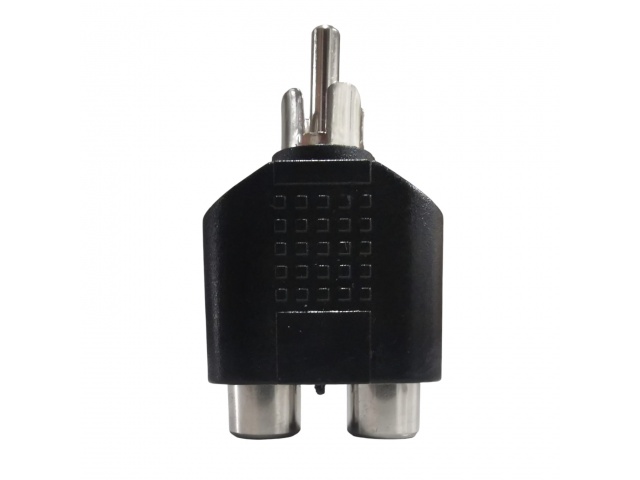 Conector adaptador de audio diseñado para combinar o adaptar dos entradas RCA hembra hacia una salida RCA macho.