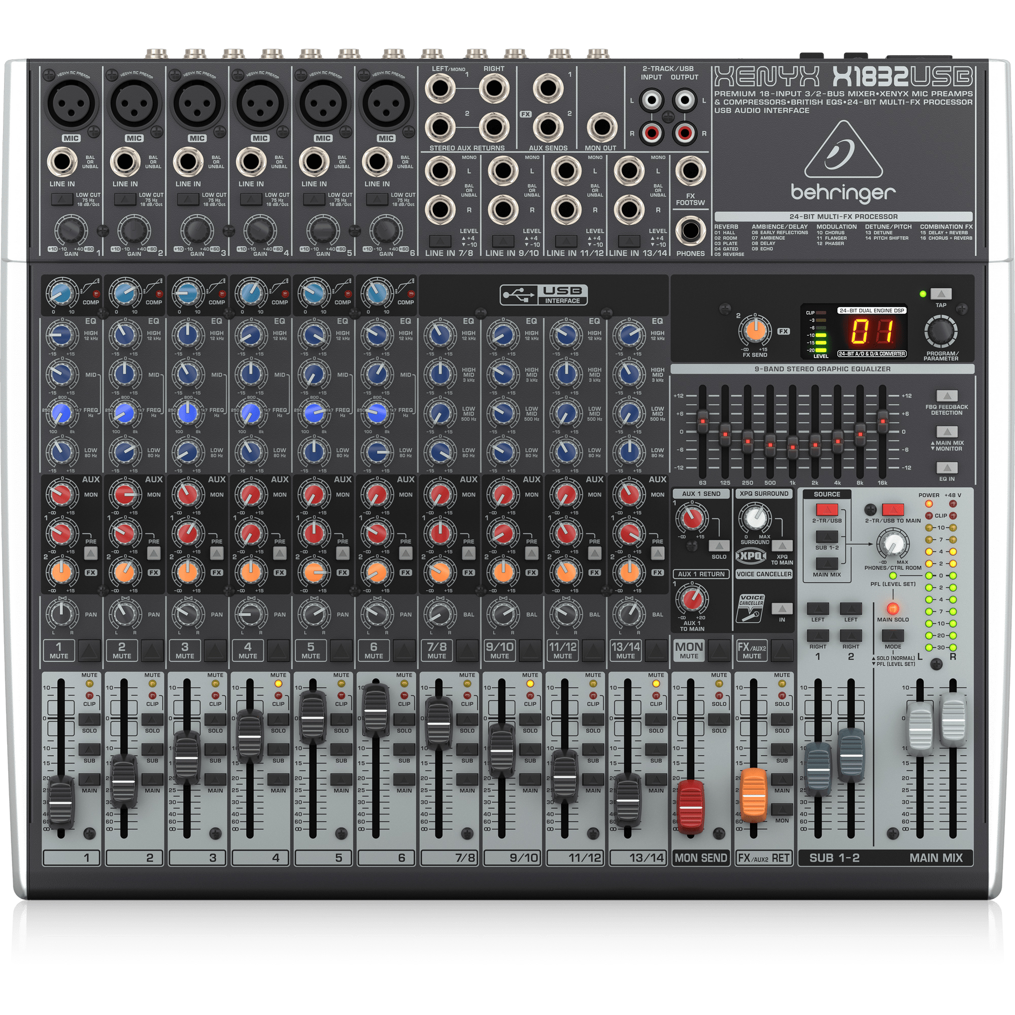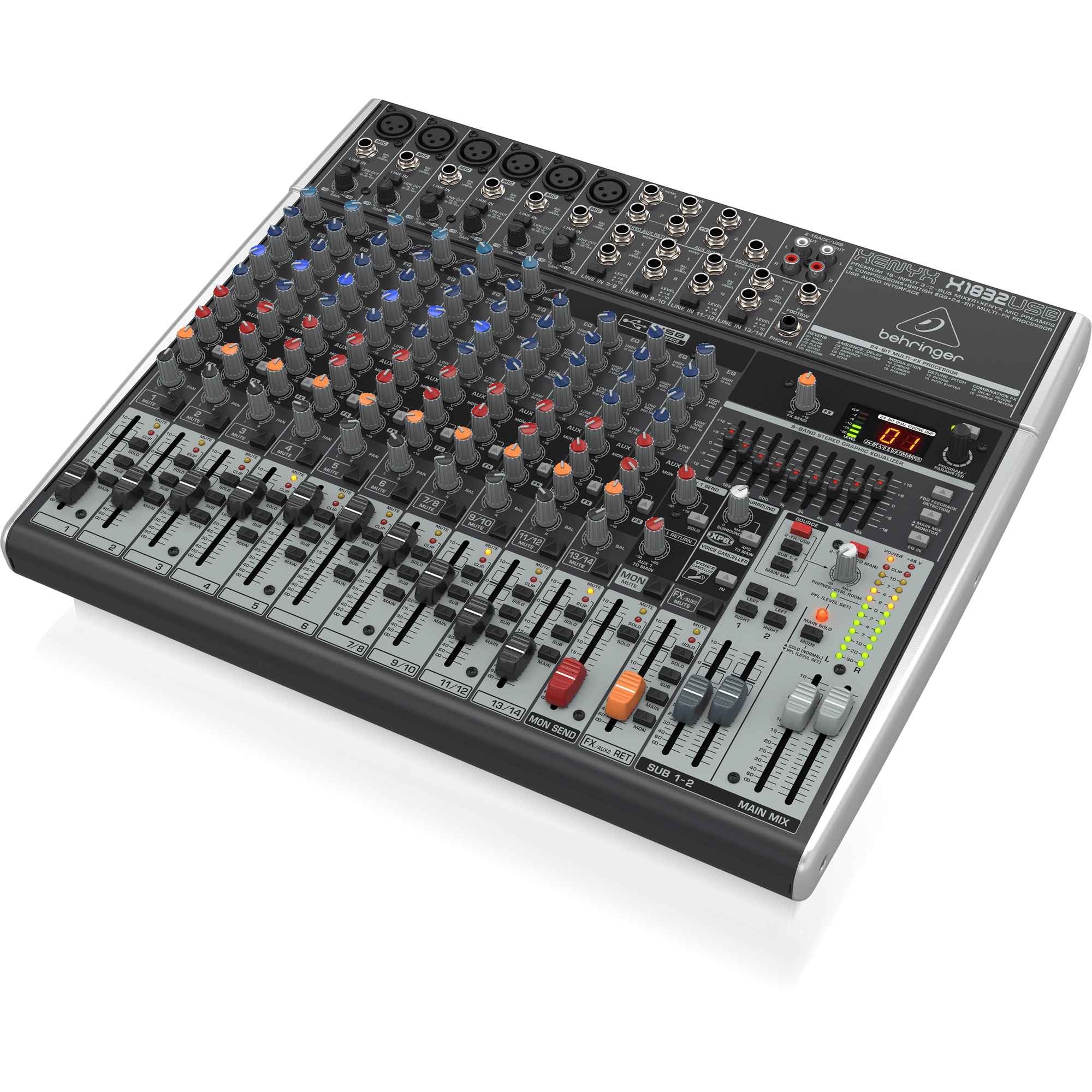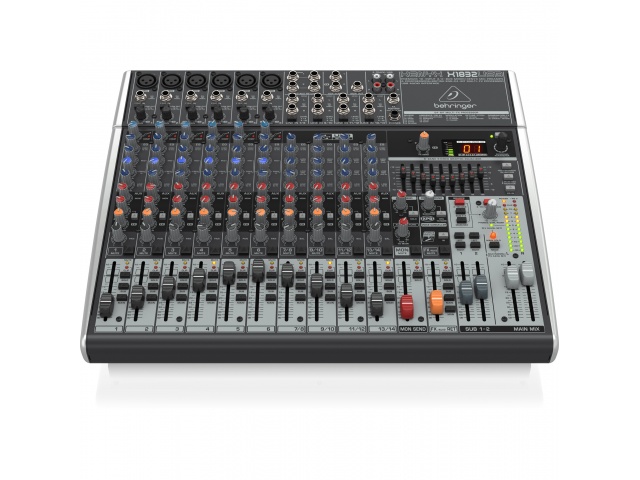 18 entradas y 3/2 buses con preamplificadores y compresores de micrófono XENYX, procesador multiefectos Klark Teknik, opción inalámbrica e interfaz USB/audio.