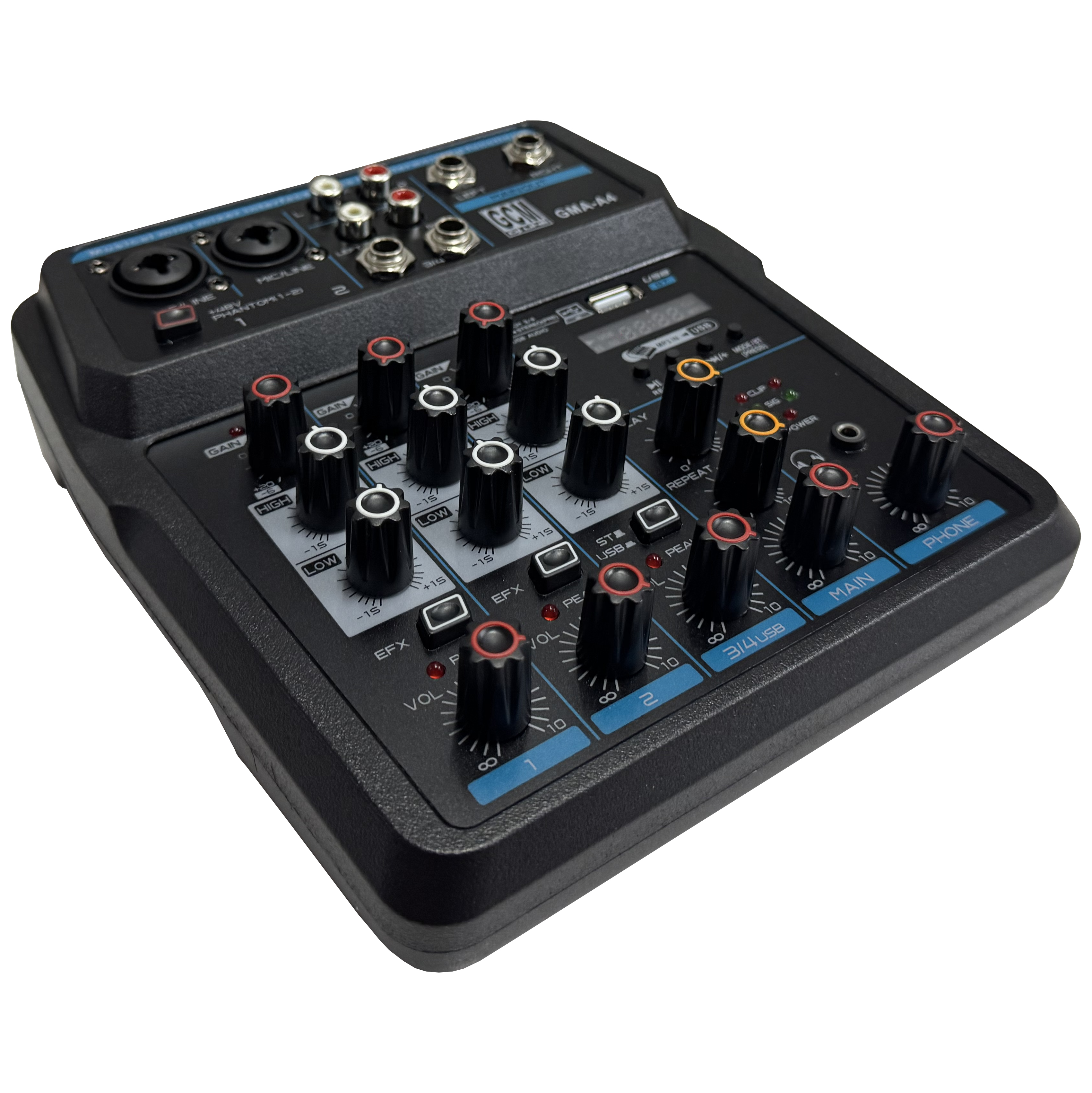 Consola de 6 entradas XLR + 4 entradas TS o TRS y 3/2 buses con preamplificadores y compresores de micrófono XENYX, ecualizador británico, procesador multiefectos de 24 bits e interfaz USB/audio.