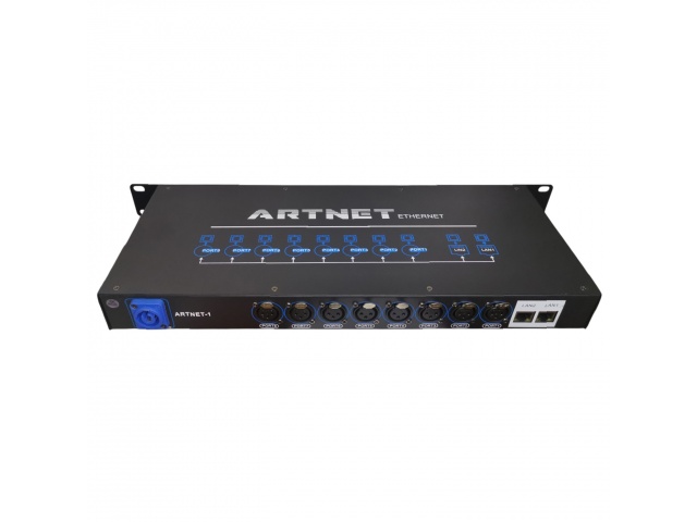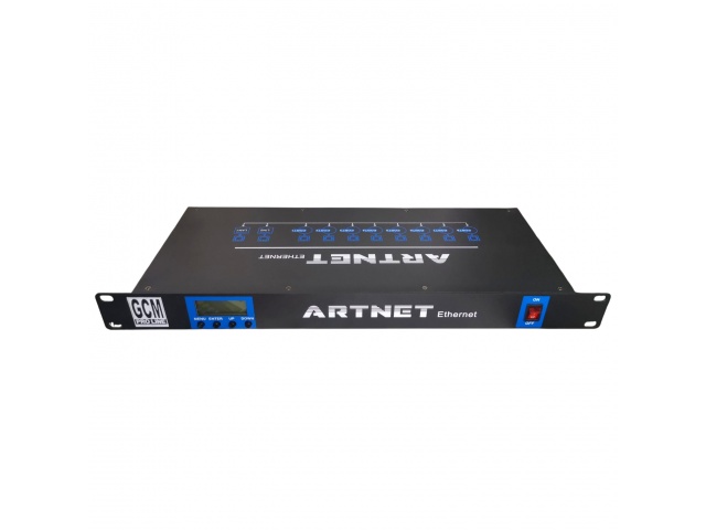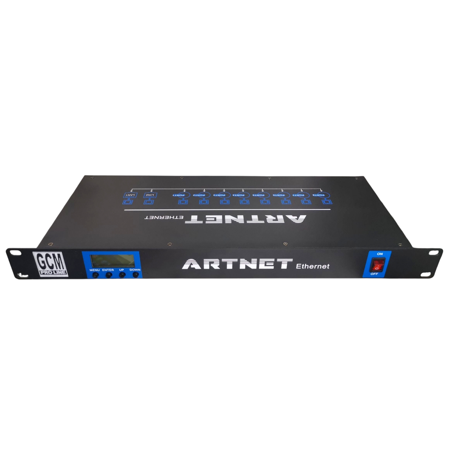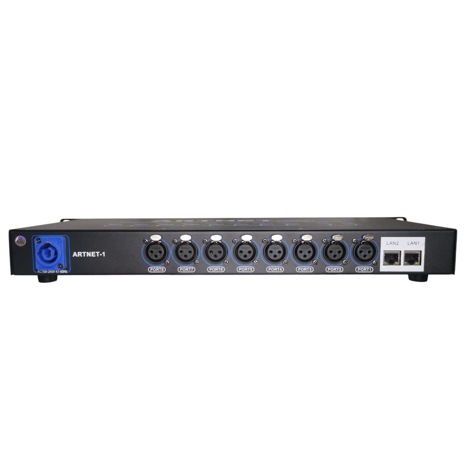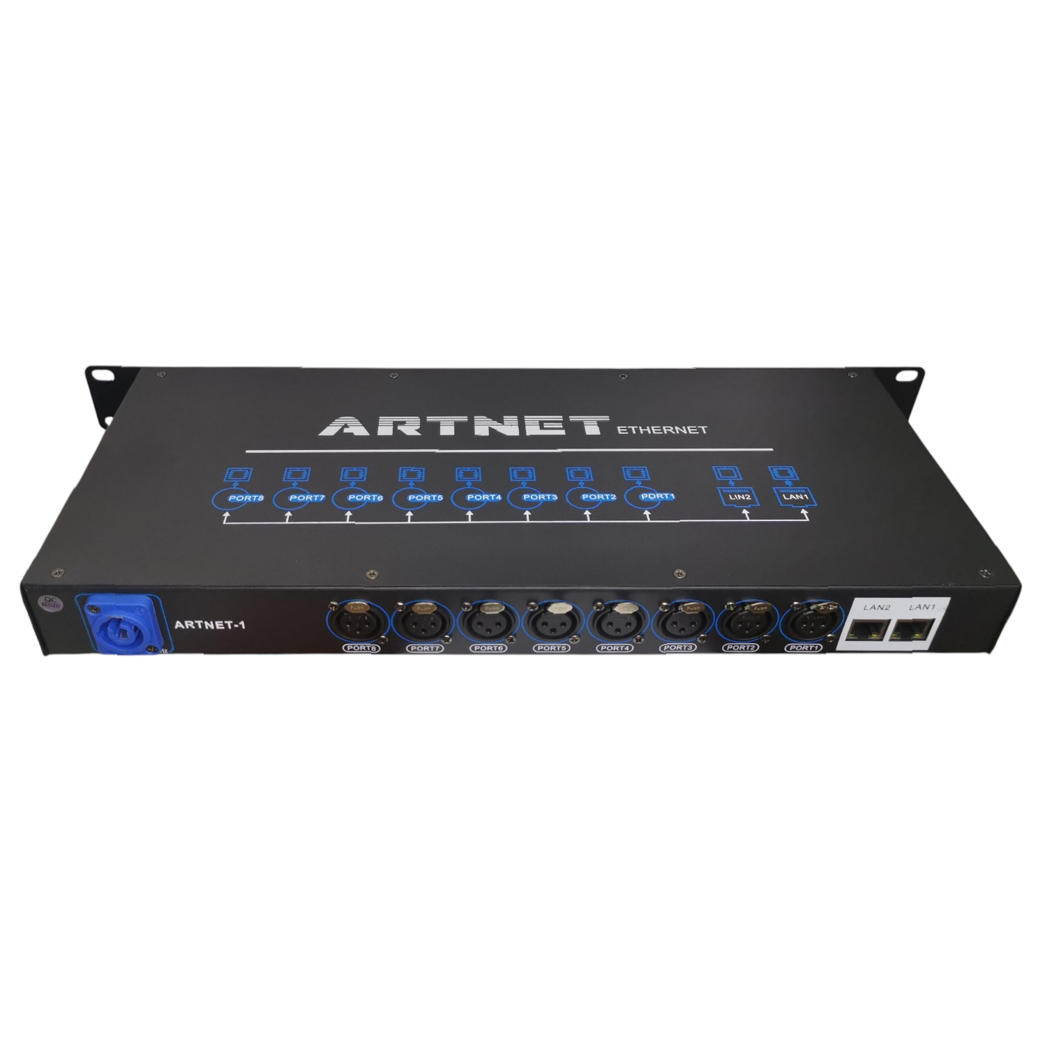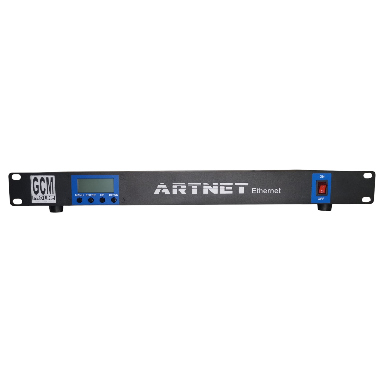 Interfaz profesional Art-Net a DMX diseñada para sistemas de iluminación escénica y arquitectónica. Permite convertir señales Art-Net a DMX512 de forma estable y confiable, integrándose fácilmente en redes Ethernet. Incorpora pantalla LCD frontal para configuración directa del dispositivo sin necesidad de software externo.